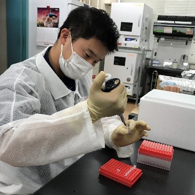 その後ご縁もあって、総合食品企業であるマルハニチロ株式会社に入社させて頂き、現在は私が専門にしていた微生物を扱う部署で日々業務を行っております。業務内容は多岐にわたり、食品中に存在する微生物を特定し、その後の対応を行うといった業務から、微生物を用いた物質生産までと、本当に幅広い業務に携わらせてもらっています。その中でも「食品中の微生物」に関する業務については、総合食品企業の食の根幹を支えるものであり、縁の下の力持ちとして日々責任を感じながら業務を行っております(写真)。