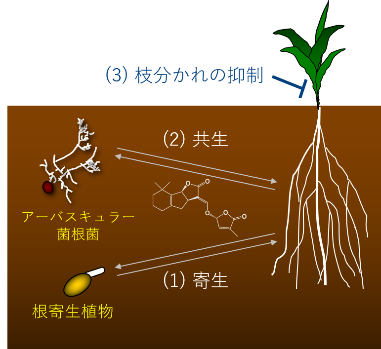 ストリゴラクトンの研究は2005年ごろから始めました。と言っても、始めた当初は「未知の枝分かれ抑制ホルモン」の研究であり、研究を進めていくうちにその正体が既知物質である「ストリゴラクトン」であることがわかったのです。ストリゴラクトンが発見されたのは、今から50年以上も前のことでした。当時からアフリカをはじめとする多くの地域で、ストライガなどの根寄生植物が農業に甚大な被害を及ぼしていました。根寄生植物は発芽後、作物の根にくっついて養分や水分を奪って成長します。ストリゴラクトンは、ストライガ種子の発芽誘導物質として、作物の根の滲出液中から発見されました。(図)。なぜ寄生される側の植物が、自身にとって有害な根寄生植物の種子を発芽させるストリゴラクトンを分泌してしまうのかは長い間不明でした。その理由は2005年に明らかになりました。ストリゴラクトンは、植物のリンなどの養分吸収を助けるアーバスキュラー菌根菌との共生を活性化する役割をもっていることがわかったのです(図)。2008年、私たちは長らくその正体が不明であった「枝分かれ抑制ホルモン」がストリゴラクトンであることを発見しました(図)。その後、私たちはストリゴラクトンの生合成や受容機構の研究を進めてきました。ストリゴラクトンの生産は、リンなどの栄養が欠乏したときに劇的に増加します。ストリゴラクトンの二面的機能は、養分に応じて「成長(枝分かれ)」と「アーバスキュラー菌根菌との共生」を最適化するための巧妙な仕組みであると考えられます。これらの知見をもとに、根寄生植物に寄生されにくい作物やアーバスキュラー菌根菌との共生能が高まった作物、さらには農業上重要な「枝分かれ数」を効果的に調節する手法の開発を目指しています。